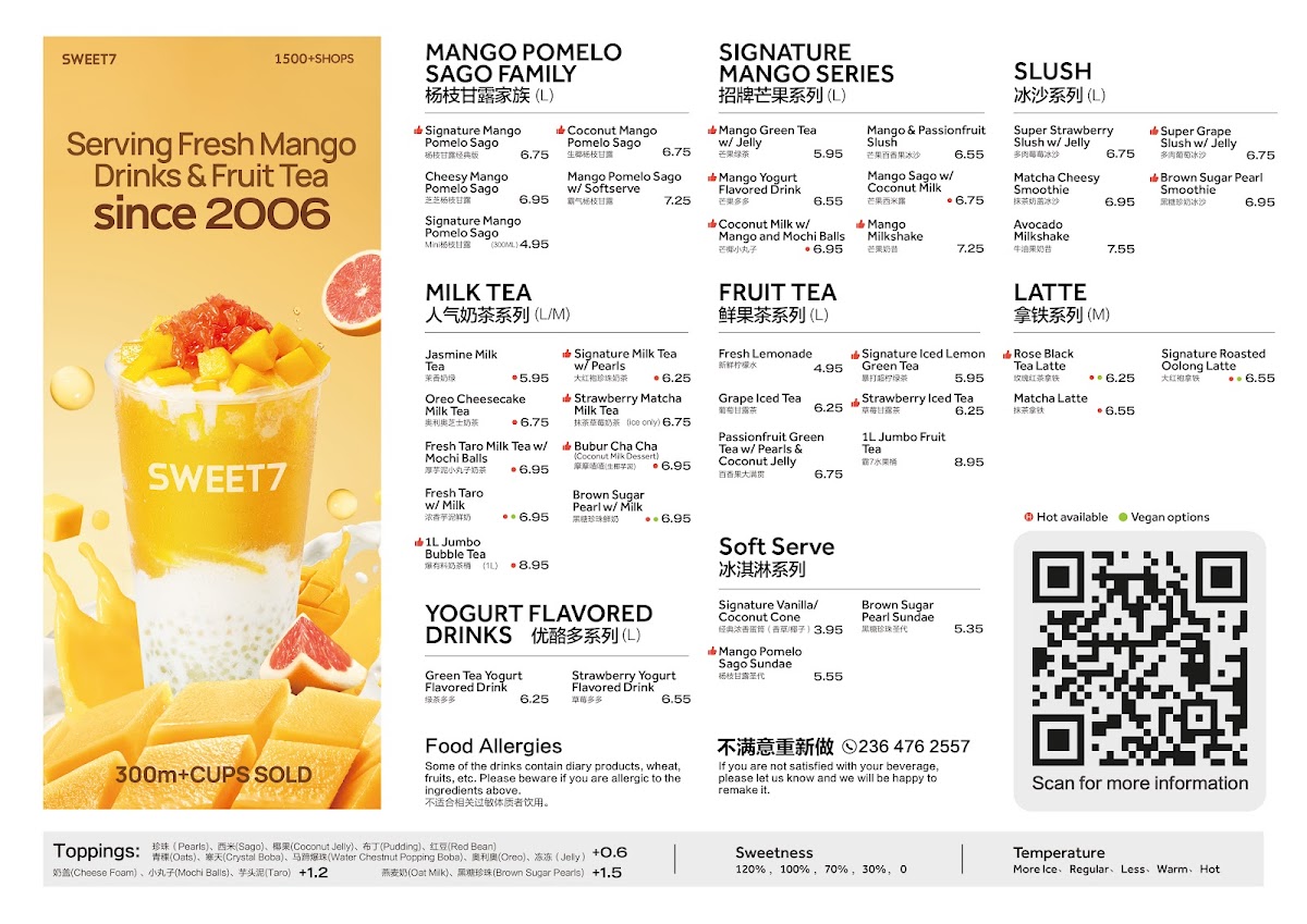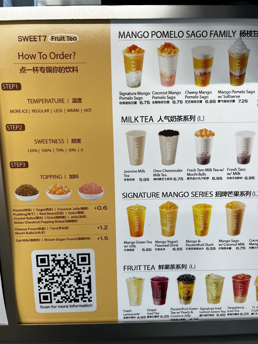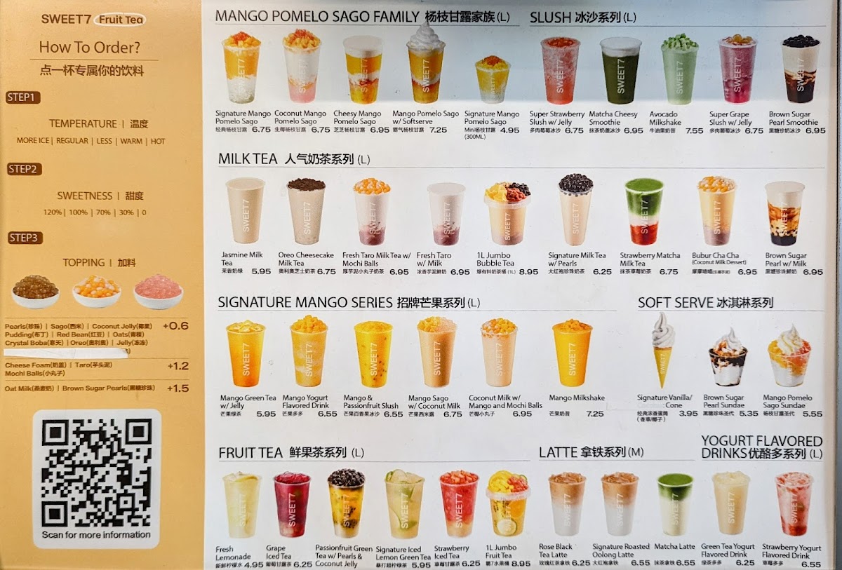 I visited Sweet7 today and had a great experience! The atmosphere is really cozy, and the service is excellent. The staff were friendly and patiently recommended a few drinks. I tried their signature milk tea, and it tasted amazing—just the right sweetness, perfectly suited to my taste. Overall, I’m really satisfied with both the drinks and the service. I’ll definitely be coming back! Highly recommend to everyone!